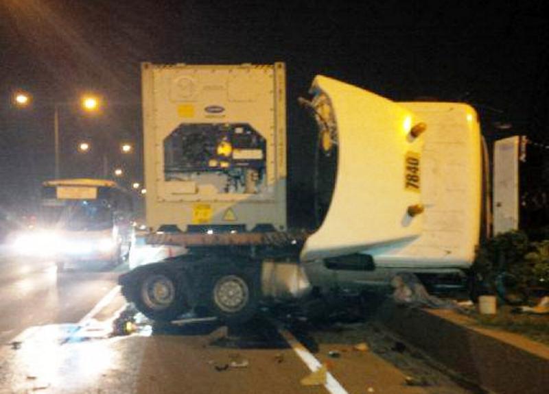 "Truk trailer B 9405 JU menabrak pembatas jalan dan terguling dengan