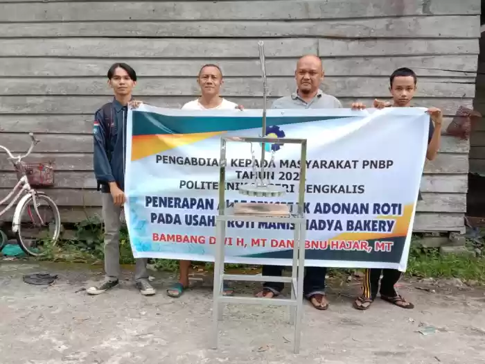 Dosen Politeknik dariJurusan mesin Politeknik Bengkalis, Bambang Dwi, H,MT, dan Ibnu Hajar MT, bersama salah seorang mahasiswa, Ibnu Gamal Al Hadit, menyerahkan satu unit alat pencetak adonan roti kepada seorang pengusaha Mikro Kecil Menengah (UMKM) yait