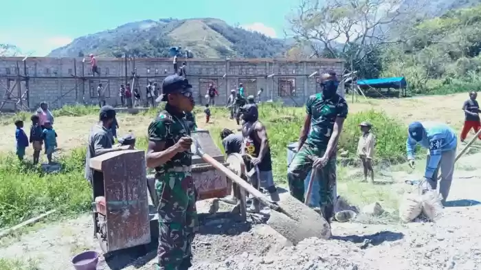 Bersama masyarakat dan Jemaat GKI Oraetlabora Kurima, Satgas Pamrahwan Yonif RK 751/VJS membangun Kantor Klasis Baliem Selatan di Kabupaten Yahukimo, Distrik Kurima, Papua.