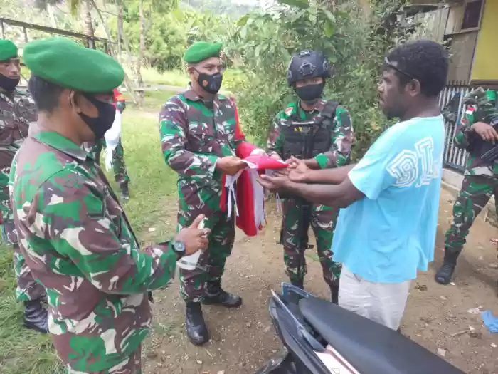 Patroli Simpatik di Kampung Dabra, Satgas TNI Yonif 751 Bagikan Bendera Merah Putih
