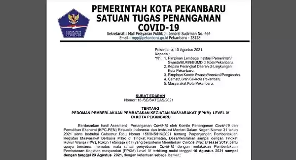 Wali Kota Pekanbaru Terbitkan Surat Edaran Perpanjangan PPKM Hingga 23 Agustus, Ini Aturan Mainnya Bagi Aktivitas Masyarakat