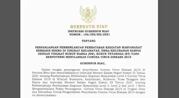 Gubernur Riau mengeluarkan Instruksi Gubernur tentang Pemberlakukan Pembatasan Kegiatan Masyarakat (PPKM) berbasis mikro di tingkat kecamatan, kelurahan/desa, sampai tingkat RW yang berpotensi menjadi wilayah penularan Covid-19.