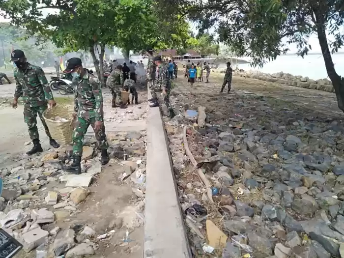 Kompi Senapan (Kipan) B Yonif 645/Gardatama Yudha menggelar kerja bakti bersama warga masyarakat membersihkan Pantai Sinam di Pemangkat Kota, Kab. Sambas, Provinsi Kalbar.