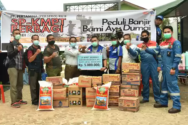 SPKMPT (Serikat Pekerja Kilang Minyak Putri Tujuh) Pertamina RU II bersama Comrel RU II menyalurkan bantuan untuk meringankan beban korban bencana alam banjir di Kelurahan Bumi Ayu Kecamatan Dumai Selatan (19/05)