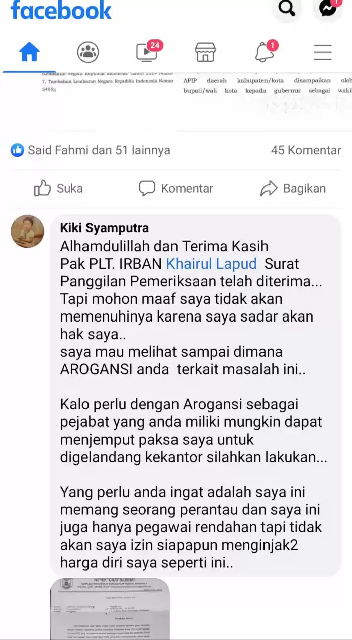 Dua pejabat beda instansi di Pemda terlibat ribut-ribut komentar di media sosial (Medsos) facebook. Akibatnya, satu diantaranya, melayangkan surat panggilan resmi.