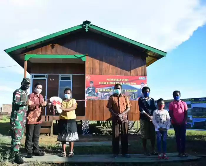anrem 174 Merauke Brigjen TNI Bangun Nawoko menyerahkan kunci rehab Rumah Tidak Layak Huni (RTLH) kepada Ibu Beatrik Ramadi putri dari Almarhum Bapak Crisantus Gaimagaimu,