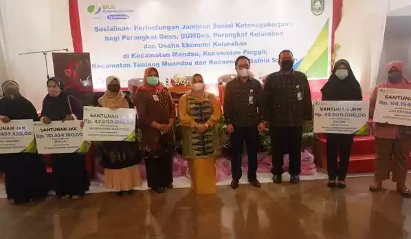 Bupati Bengkalis Kasmarni, menyerahkan secara simbolis santunan kepada ahli waris 5 peserta BPJS Ketenagakerjaan Cabang Duri yang meninggal dunia, Kamis (01/04/21) di Hotel Surya, Duri.