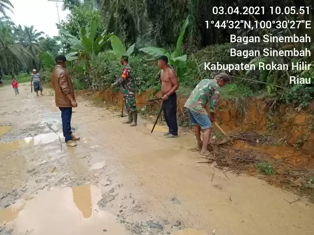 Babinsa Koramil 03/Bgs Goro bersama Warga Perbaiki Jalan