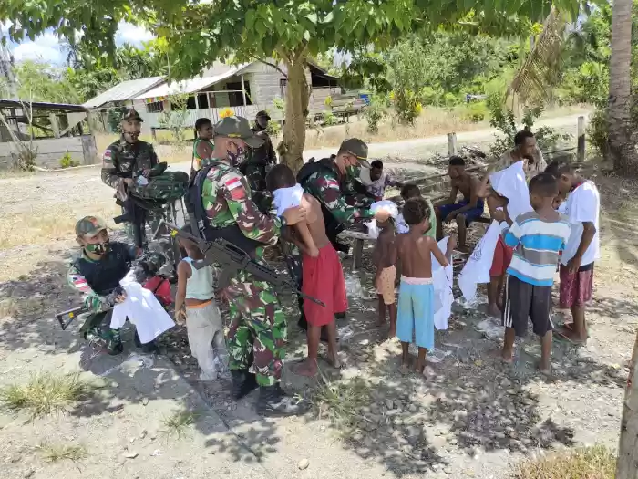 Prajurit TNI Satgas Pamtas RI-PNG Sektor Utara Yonif 131/Braja Sakti menyambangi warga dan membagikan baju kaos bergambar jam dan coklat kepada anak-anak di Kampung Yetti, Kec. Arso Timur, Kab. Keerom, Papua, Senin (22/3/2021).