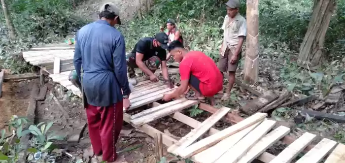 Bersama Warga, Prajurit Satgas Yonif 642 Perbaiki Jembatan Yang Rusak Akibat Banjir