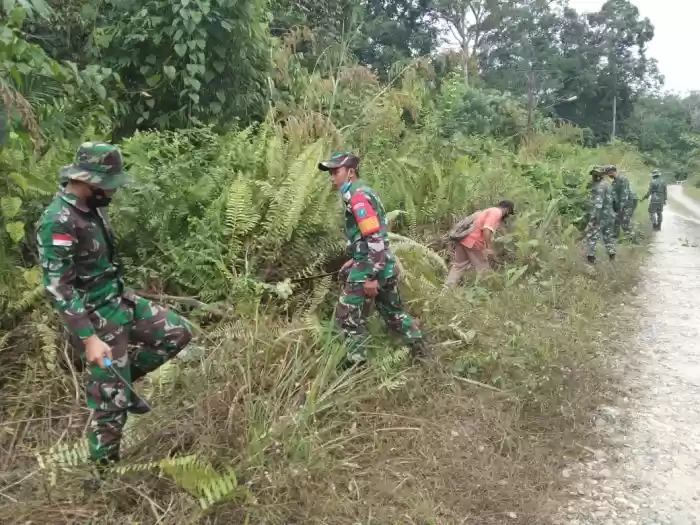 Personel Satgas TNI Manunggal Membangun Desa (TMMD) ke-110 Kodim 1206/Psb melaksanakan gotong royong bersama warga Dusun Tintin Kemantan, Desa Hulu Pengkadan, Kec. pengkadan, Kab. Kapuas Hulu. Senin (1/3/2021).