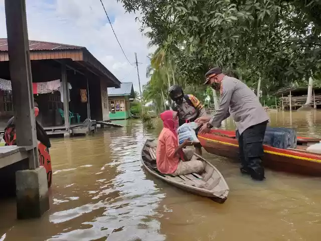Banjir yang melanda wilayah Kepenghuluan Air Hitam akibat curah hujan yang tinggi, Kapolsek Pujud Polres Rokan Hilir bersama jajaran serahkan bantuan kepada warga korban kebanjiran.