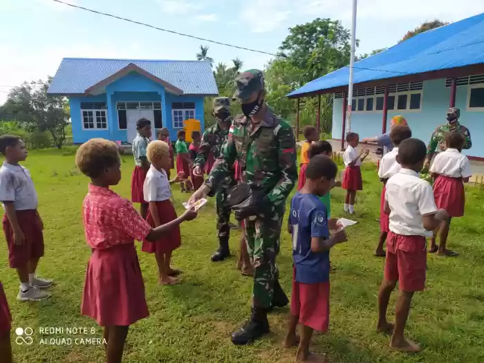 Sebagai wujud kepedulian terhadap generasi muda, Satgas Pamtas RI-PNG Yonif 125/Simbisa di bawah Komando Pelaksana Operesi Korem 174/ATW bagikan masker kepada siswa-siswi Sekolah Dasar YPK Toray, Distrik Sota, Kabupaten Merauke.
