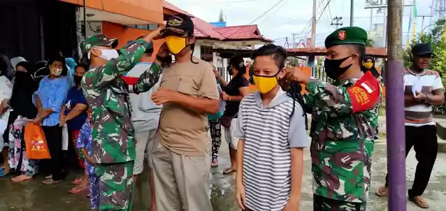 Untuk mencegah penularan virus Corona atau Covid-19, anggota Koramil 03/Bgs Kodim 0321/Rohil melaksanakan penegakan protokol kesehatan dengan membagikan masker gratis kepada masyarakat penerima Bantuan Langsung Tunai (BLT)