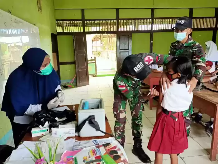 Satgas Pamtas Yonif 642/Kapuas membantu Puskesmas Desa Aruk berikan Imunisasi DPT (Difteri, Pertusis dan Tetanus) kepada siswa-siswi Sekolah Dasar (SD) Negeri 01 Aruk,