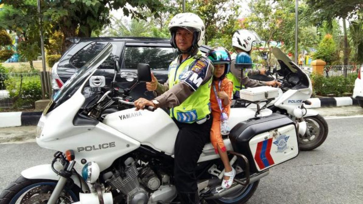 PEKANBARU- Terimakasih Om Polisi, ucap Tia setelah turun dari motor 900 cc milik patroli Polantas Polresta Pekanbaru, Senin