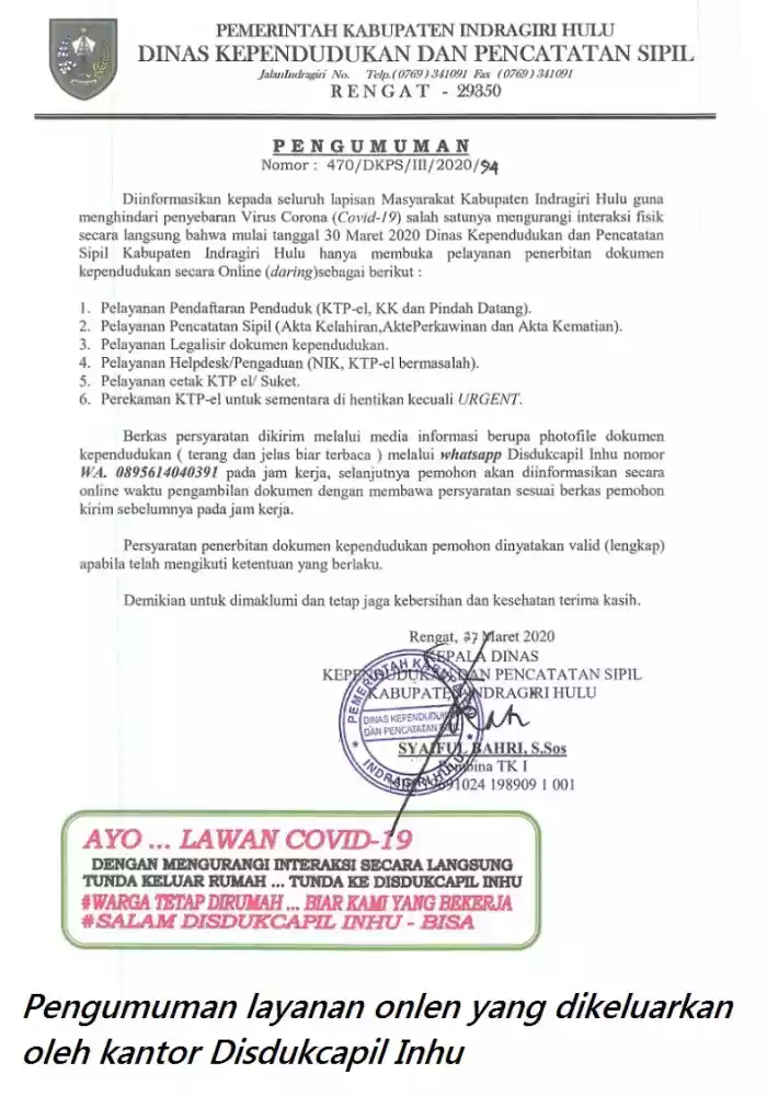 pemberitahuan kepada masyarakat Inhu bahwa semenjak tanggal 30 Maret 2020 Disdukcapil tidak lagi melayani pengurusan Adminduk secara langsung, artinya jika selama ini masyarakat yang mengurus Adminduk, seperti Kartu Tanda Penduduk (KTP), Kartu Keluarga (KK), akte kelahiran serta lainnya harus datang kekantor Disdukcapil.
