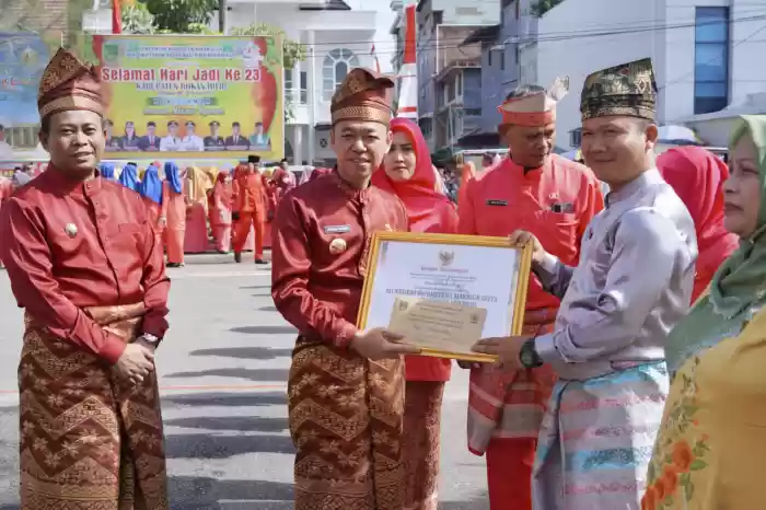 BAGANSIAPIAPI-Bupati Rohil Afrizal Sintong, SIP secara langsung memimpin upacara peringatan HUT Kabupaten Rokan hilir yang ke 23 Tahun 2022, kegiatan tersebut dilaksanakan di depan kantor BPKAD, Jalan Merdeka, Bagansiapiapi, Selasa (4/10/2021).