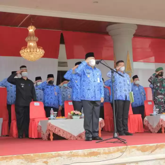 ROHUL- Bupati Rokan Hulu H.Sukiman bertindak sebagai Inspektur Upacara dalam rangka Hari Pahlawan tahun 2021 bertempat di Halaman Kantor Bupati Rokan Hulu, Rabu (10/11/2021).