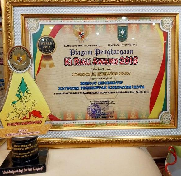 KI Award adalah bentuk apresiasi kepada badan publik yang telah melaksanakan undang-undang keterbukaan informasi publik. Untuk penghargaan KI Award 2019, Indragiri Hulu menerimanya saat acara Pemeringkatan dan Penganugerahan Keterbukaan Informasi Badan Publik Se-Provinsi Riau KI Riau Award yang diselenggarakan Komisi Informasi (KI) Provinsi Riau tahun 2019.