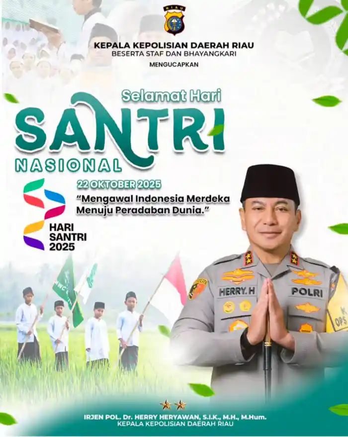 Pekanbaru-Di Hari Santri Nasional yang diperingati pada 22 Oktober 2025, Kepala Kepolisian Daerah Riau, Irjen Pol. Dr. Herry Heryawan, S.I.K., M.H., M.Hum., menyampaikan ucapan selamat dan apresiasi mendalam kepada seluruh santri di Provinsi Riau. Ucapan ini mewakili seluruh jajaran Polda Riau, para Kapolres, Kapolresta, Kapolsek, serta seluruh personel Polda Riau.