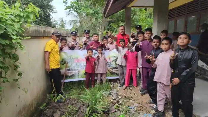 DUMAI - Polres Dumai melalui Polsek Sungai Sembilan melaksanakan kegiatan edukasi dan penanaman pohon dalam rangka program Green Policing di Sekolah Dasar (SD) Negeri 003 Kelurahan Bangsal Aceh, Kecam