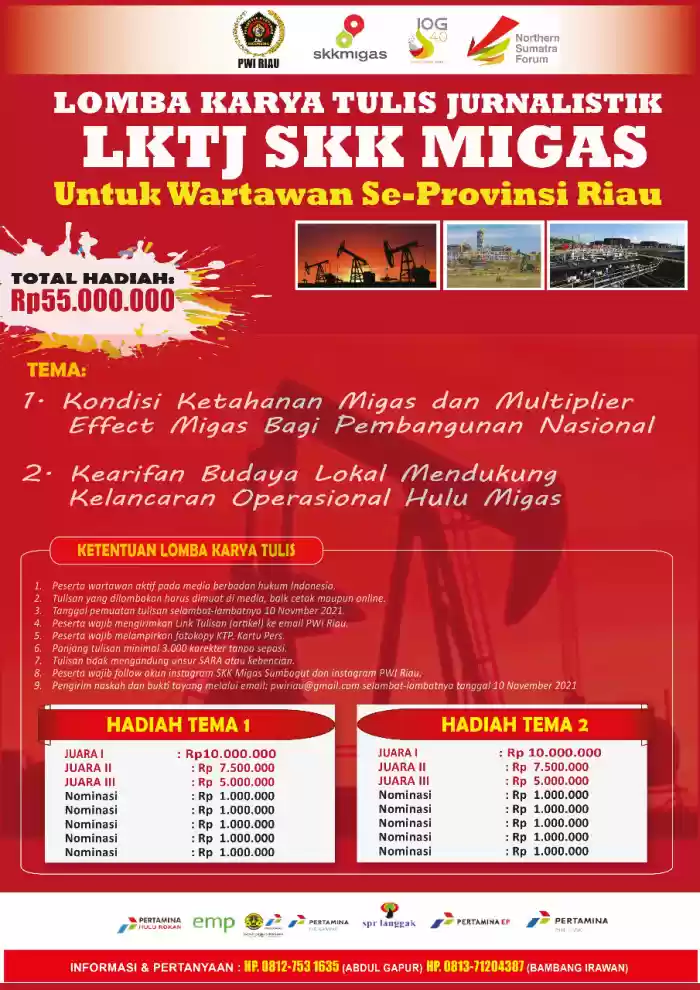 PEKANBARU - Lomba Karya Tulis Jurnalistik (LKTJ) yang diselenggarakan Satuan Kerja Khusus (SKK) Migas Sumbagut bersama PWI Riau dijadwalkan akan diumumkan pada 25 November mendatang.Itu disampaikan Ya
