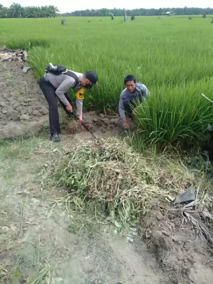 Polisi di Rimba Melintang ini Ikut Bersihkan Rumput di Pematang Sawah