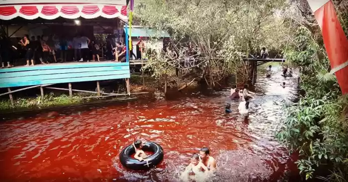 Ya, air merah yang mengalir di sungai ini merah menjadi daya tarik bagi para wisatawan.