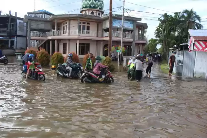 Air Pasang Yang terjadi di Tembilahan, Inhil rwndam sejumlah ruas jalan. Personel Kodim 0314 bersama Polres Turun Bantu masyarakat.