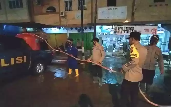 Sejumlah personil Polres Inhil bekerja hingga malam. Menyedot air genangi jalan di Tembilahan.