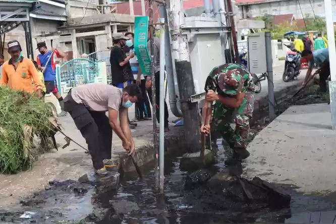 Kekompakan personil Kodim 0314/Inhil dan Polres Inhil berlanjut. Bersama gelar karya bakti, bersih-bersih got.