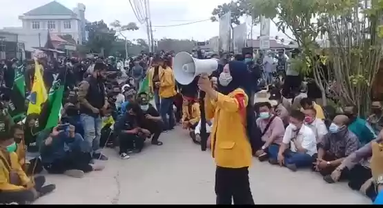 Ratusan mahasiswa Indragiri Hilir yang tergabung dalam GMNI, PMII, HMI dan Ikami Sulsel menggelar aksi damai di Kantor DPRD Inhil Jalan HR Soebrantas Tembilahan, Senin (12/10/2020)