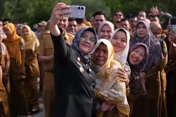 Riauterkini-SIAK - Bupati Siak Afni Z, menjadi pemimpin apel Senin, di lingkungan pemerintah Kabupaten Siak, Senin (7/7/25) di halaman kantor Bupati Siak.