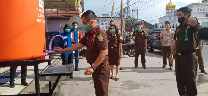BAGANSIAPIAPI- Kejaksaan Negri (Kejari) Rokan Hilir gelar kegiatan sosial nyata dengan menyedikan dua tangki didua lokasi pencuci tangan. Peletakan tangki lansung dilakukan Kepala Kejari Rohil,Gaos Wicaksono,SH,MH,Selasa (14/04/2020) sore.