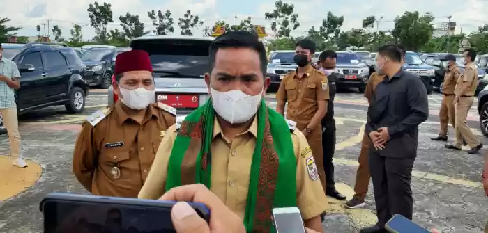 Bupati Pelalawan H. Zukri didampingi wakil bupati H. Nasarudin, SH, MH meninjau lokasi pengumpulan Mobil Dinas (Mobnas), tepatnya di lapangan upacara, halaman kantor bupati, Senin (3/5/2021). Saat ditinjau kurang lebih, 150 unit mobil didata dan terkumpul