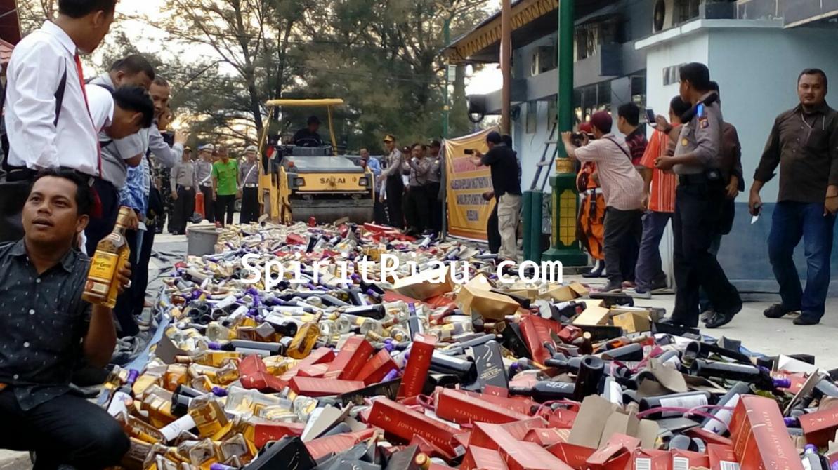 DUMAI - Ribuan botol miras dari berbagai merk hasil tangkapan Polres Dumai dimusnahkan dengan cara digilas dengan sebuah alat berat, pada Kamis (