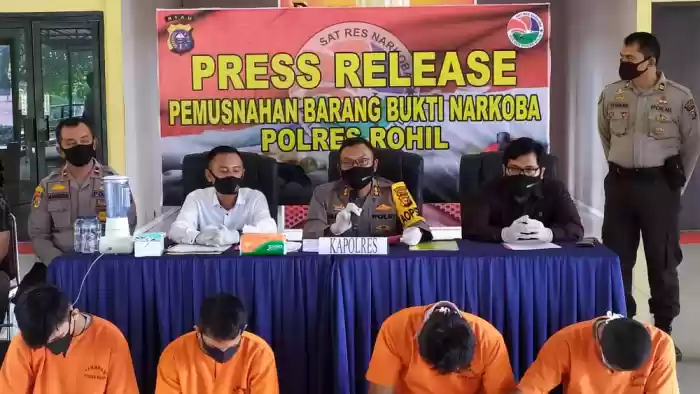 UJUNGTANJUNG-Polres Rokan Hilir (Rohil) melakukan pemusnahan barang bukti narkoba seberat 123,92 gram dari pengedar narkoba yang dilakukan penangkapan oleh tim Satres Narkoba Polres Rohil dari pengedar yang berada di Balam dan Bagansinembah.