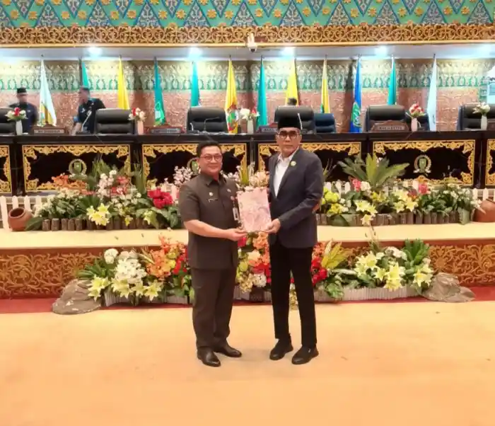 Pekanbaru - Anggota DPRD Riau menggelar Rapat Paripurna Laporan Keterangan Pertanggung Jawaban (LKPJ) Pemprov Riau 2025, Senin (9/3) di Kantor DPRD Riau, Pekanbaru.